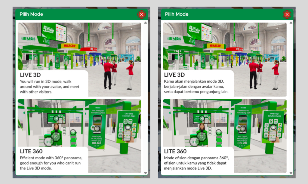 Fitur ini juga memberikan keuntungan bagi Event Organizer (EO) pameran virtual dimana dapat memperluas target pengunjung pameran virtual. Acara pameran virtual juga dapat dihadiri tidak hanya pengunjung pameran virtual dari dalam negeri saja, namun dari luar negeri. Pengunjung pameran virtual dari luar Indonesia dapat menggunakan bahasa Inggris untuk menjelajahi pameran virtual. Fitur ini pun dapat diakses oleh pengunjung pameran virtual melalui halaman login/register maupun pada saat sudah login. Lalu bagaimana cara untuk mengakses fitur UI Languages pada platform pameran virtual Simhive?