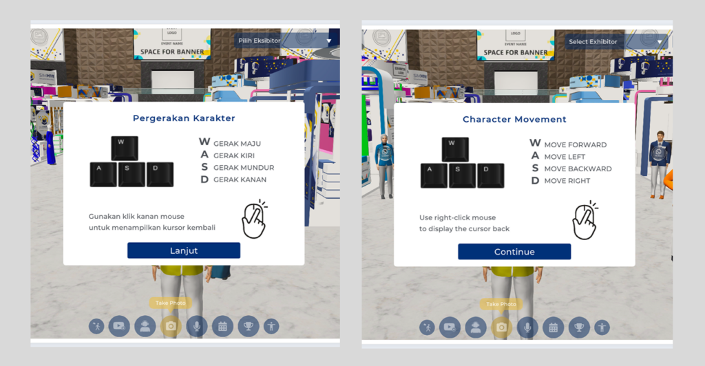 Anda sebagai pengunjung pameran virtual dapat menggunakan fitur ini dan mengganti bahasa di pameran virtual melalui halaman login/register ataupun ketika Anda sudah login. Pada halaman login/register, Anda dapat langsung klik dropdown pada pojok kanan atas layar. Kemudian pilih bahasa yang Anda inginkan ketika ingin masuk ke pameran virtual. Jika Anda ingin mengganti bahasa ketika sudah login, Anda dapat langsung klik tombol settings pada sidebar, kemudian klik dropdown untuk mengganti bahasa. Sangat mudah bukan?